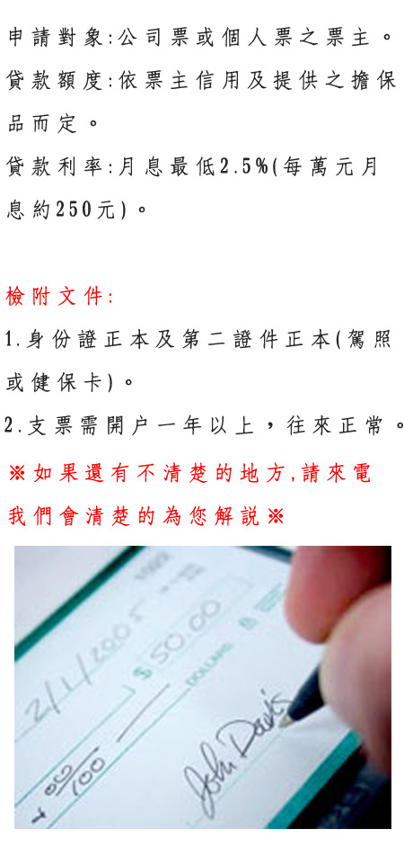支票貼現簡單來說就是,當你需要現金時,或是要使用自己或他人的未到期支票,向銀行或任何願意借錢給你的個人或單位抵押或質借,以雙方議定的......2019-12-28